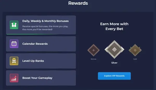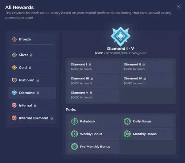 Rainbets lojalitetssystem er progresjonsbasert — du tjener rang ved å omsette på kvalifiserende spill og blir automatisk registrert, med start på Bronze I. Fremdriften din spores i sanntid på dashbordet ditt. Rangene går gjennom Bronze, Silver, Gold, Platinum, Diamond, Infernal og Infernal Diamond. Infernal Diamond I krever €848,400,000 i omsetning.