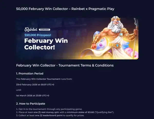Februar blir konkurransepreget hos casino Rainbet. Fra 23. februar til 1. mars 2026 kjører vi Winner Collector Tournament — et resultattavle-event der de største multiplikatorgevinstene dine avgjør rangeringen, og de 100 beste spillerne deler en premiepott på €42,420. Deltakelse er gratis. Registrer deg via et kvalifiserende spill, legg inn et minimumsspinn på €0.50, og start å samle poeng.