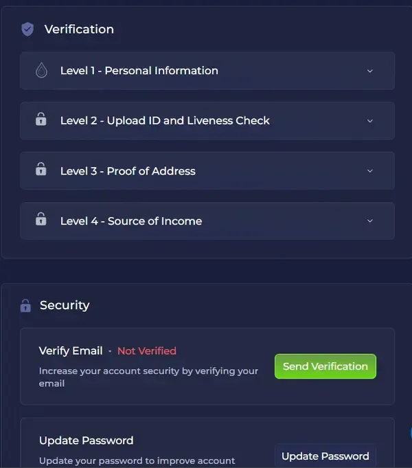 Vær oppmerksom på at uverifiserte kontoer har et samlet innskuddstak på €500 og kan ikke behandle uttak før KYC er fullt godkjent. Kontoen din, saldoen og gevinstene dine kan ikke overføres, selges eller pantsettes til en tredjepart under noen omstendigheter.